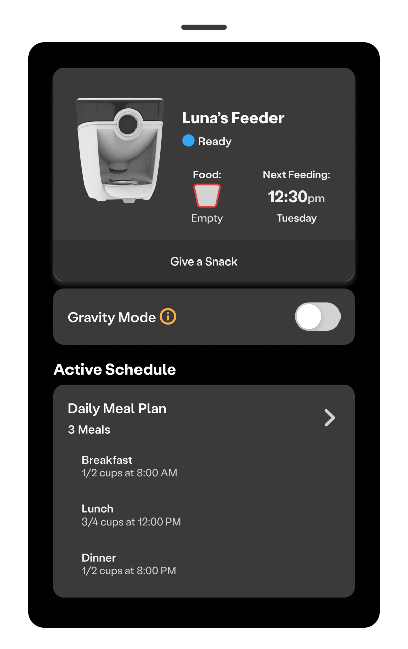 Stay connected to your pet’s needs wherever you are. Customize schedules with precise portion sizes and meal times, track feeding habits to ensure consistent nutrition, and give your pet a snack with just a tap.