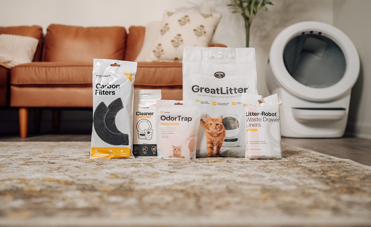 Cat essentials for your Whisker robots can be auto-delivered to suit your needs. Our lineup of subscription products include GreatLitter, specially formulated for Litter-Robot; OdorTrap to neutralize litter box odors; Carbon Filters to further absorb odors in the waste drawer; Waste Drawer Liners for a custom fit and easy emptying; and Cleaner Spray and Wipes for pet-safe freshening up.